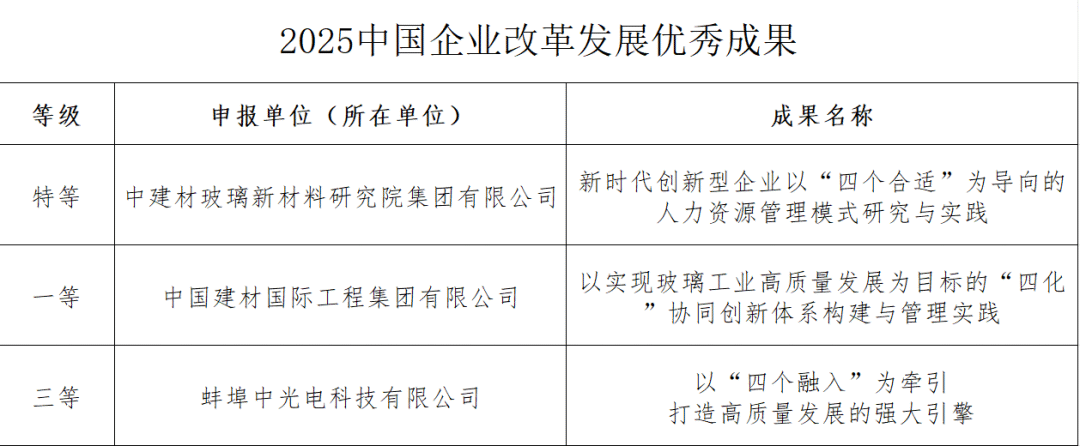 近期,2025(第九届)中国企业改革开展优秀成果评选结果正式揭晓。中研院集团创造的《新时代创新型企业以“四个合适”为导向的人力资源管理模式研究与实践》荣获特等奖;国际工程创造的《以实现玻璃工业高质量开展为目标的“四化”协同创新体系构建与管理实践》荣获一等奖;蚌埠中光电创造的《以“四个融入”为牵引打造高质量开展的强大引擎》荣获三等奖。